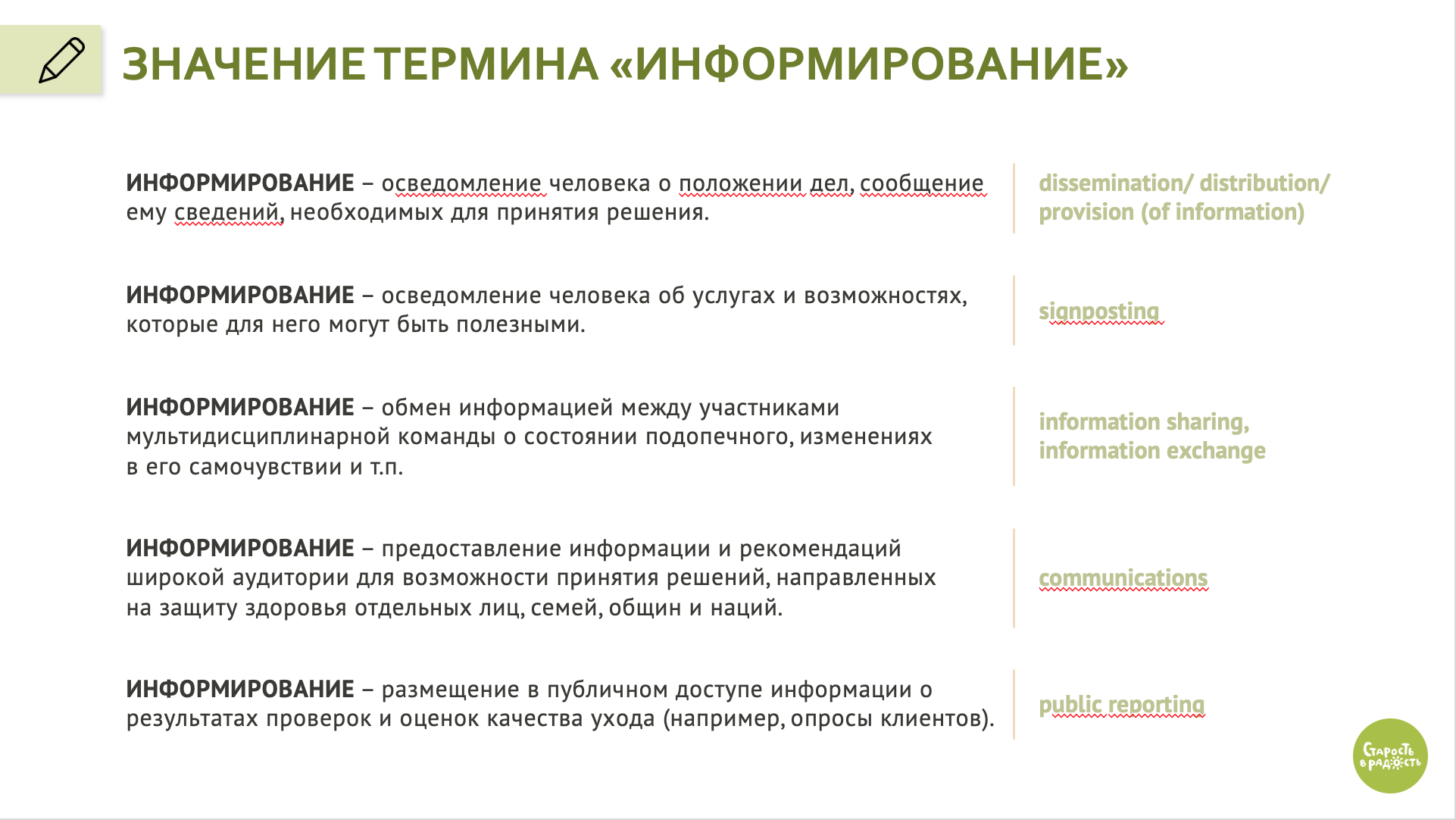 Главный раздел курса дает представление о том, из чего состоит и как функционирует информирование в системе долговременного ухода.