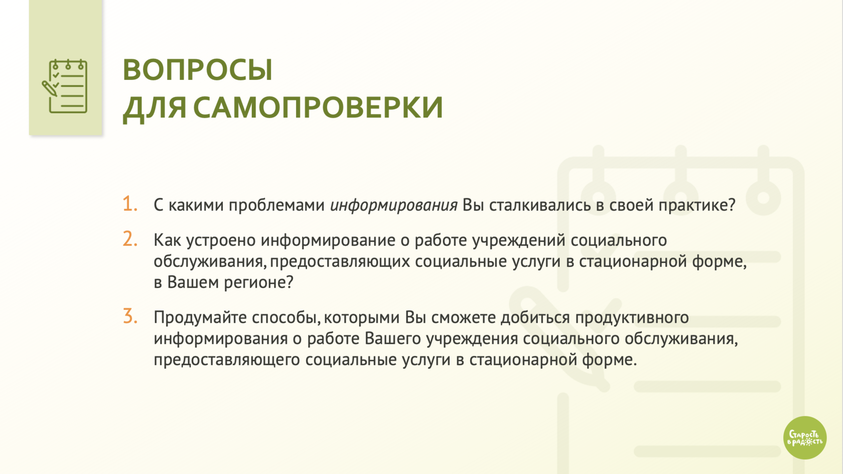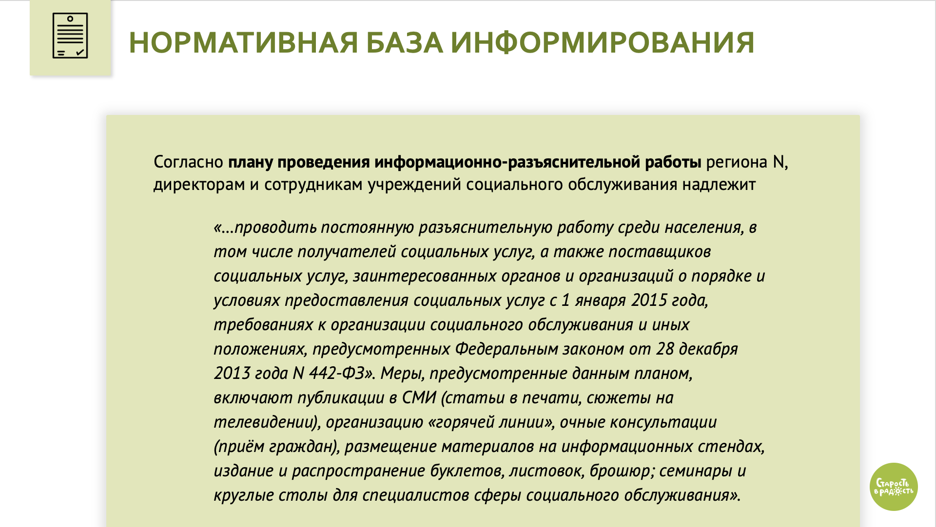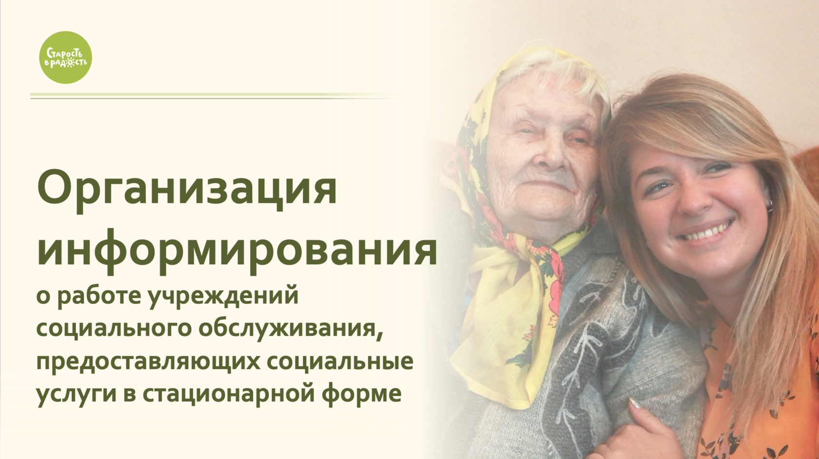 Эта презентация – методическое сопровождение к разделу 3 «Организация информирования» курса «Организация информирования о системе долговременного ухода в учреждениях социального обслуживания, предоставляющих социальные услуги в стационарной форме».